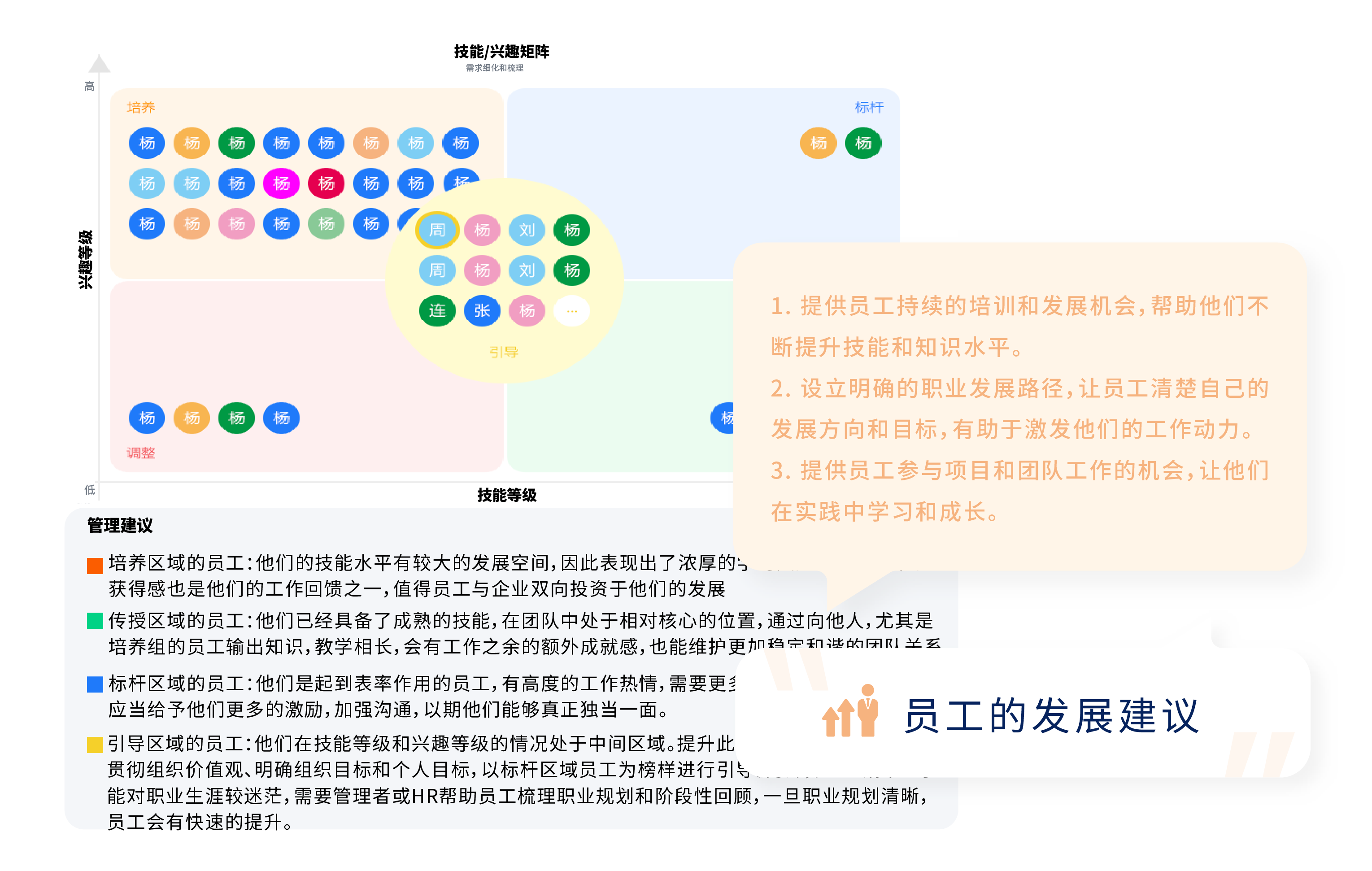 技能等级 x 兴趣等级矩阵,定位人才,并为不同区域人才分别提供管理建议,促进人事相宜