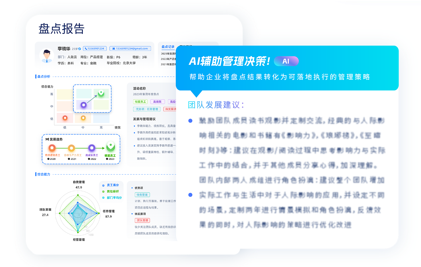 不受限于企业发展阶段与人才数据条件,可凭借人才多维度表现,实现灵活准确的人才盘点